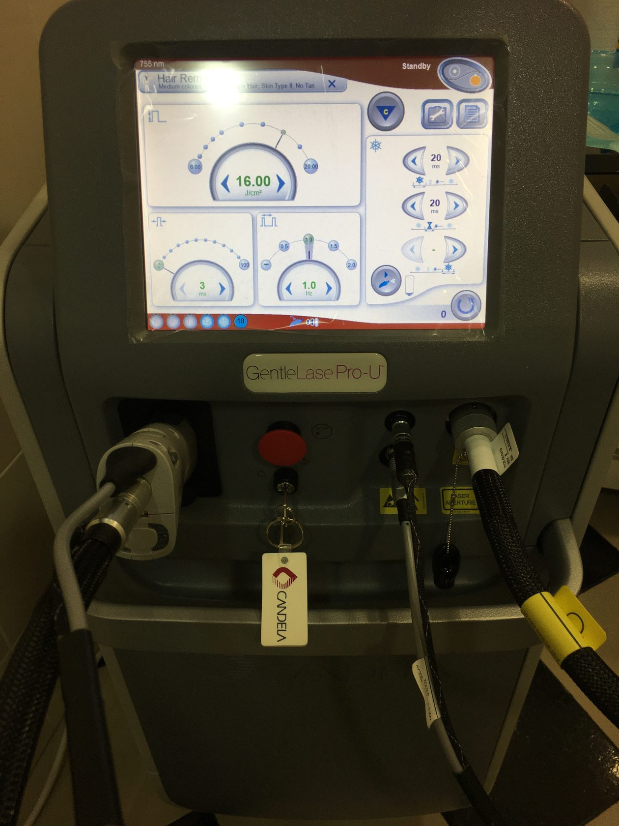 1 вспышки на лазере Candela достаточно для того, чтобы удалить волосы на участке кожи, равному 18 мм (это число соответсвует размеру насадки). Необходимая зона для обработки расчерчивается для удобства специалиста и исключения пропуска волос белым косметическим карандашом, который легко удаляется влажными салфетками. Родимые пятна (невусы) и татуировки строго обходят, не подвергая действию лазера. Благодаря встроенной системе обезболивания с криогеном, сеанс проходит максимально комфортно. В обязательном порядке специалист и клиент одевают специальные очки, которые защищают глаза от лазерного излучения. Дело в том, что радужная оболочка глаза, содержит меланин, который по принципу действия лазера благополучно разрушается и может привести к нарушению или потери зрения. Параметры работы лазера подбираются специалистом индивидуально под каждого человека.